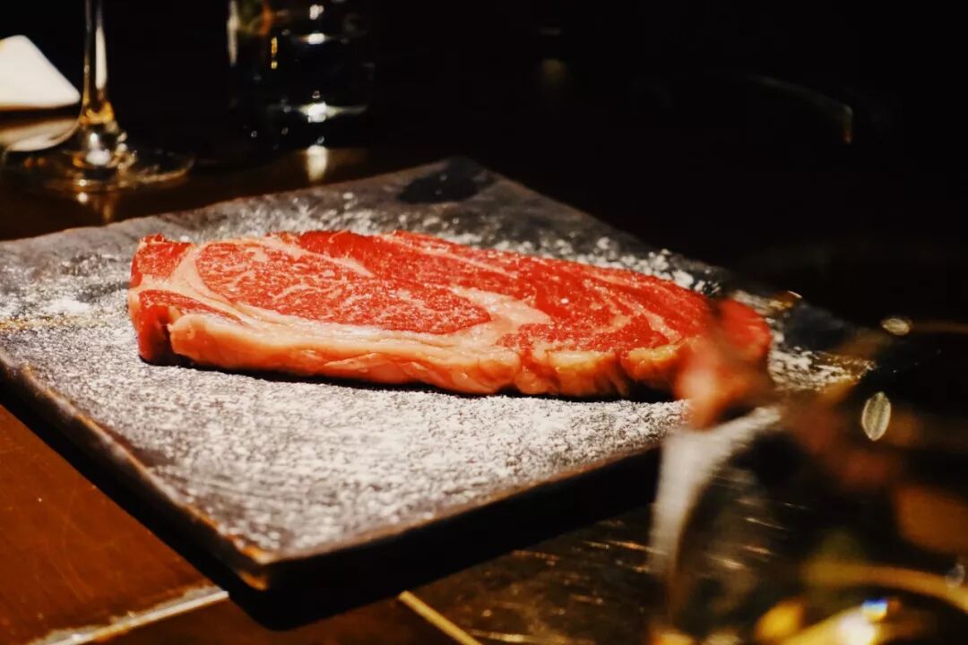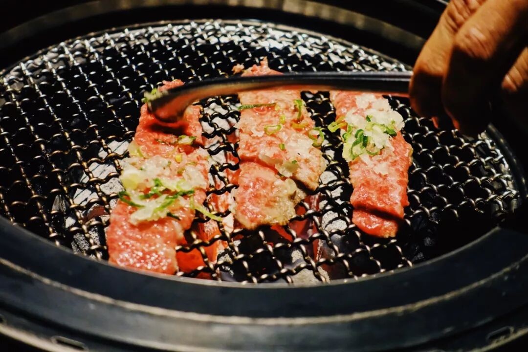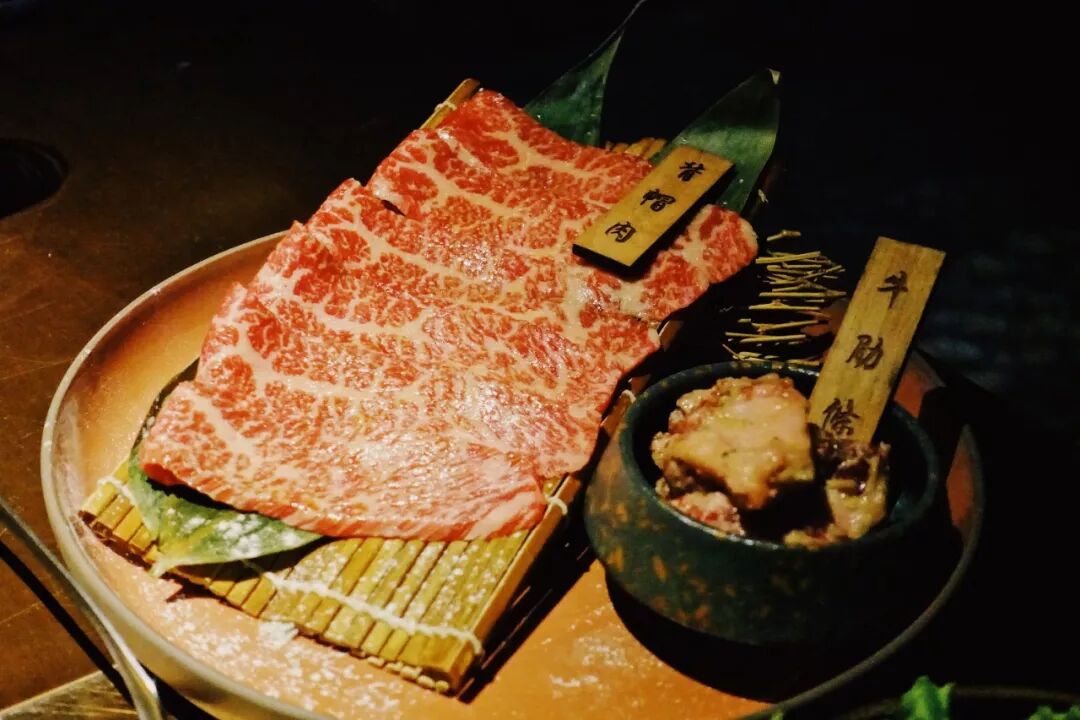 肉的部分,因为本人并不爱太肥的和牛,偏瘦的肩胛牛排(200元/100克)在桌边切给你,烤完还会剪成小条方便分食,Rib Cap (158元)是我很喜欢的部位,片长条小葱配盐烤单面;肥瘦相间带小肉筋的牛肋条(135元),抹上辣酱包在生菜里囫囵塞进口里,香辣肥美,汁水横流。