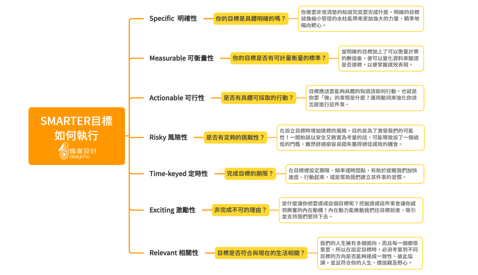 每個特徵彼此之間都是環環相扣的,接下來就讓我們透過 SMARTER目標的七大特徵來一一檢視如何設定目標吧!